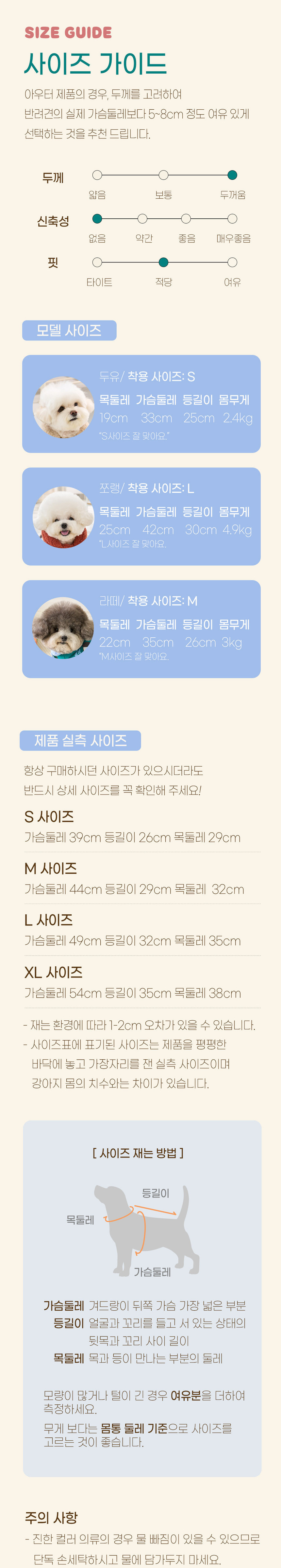 L:胸圍49cm、背長32cm、脖圍35cm XL: 胸圍54cm、背長35cm、脖圍38cm • 因外套厚度關係,建議選擇比胸圍多出約5-8cm |