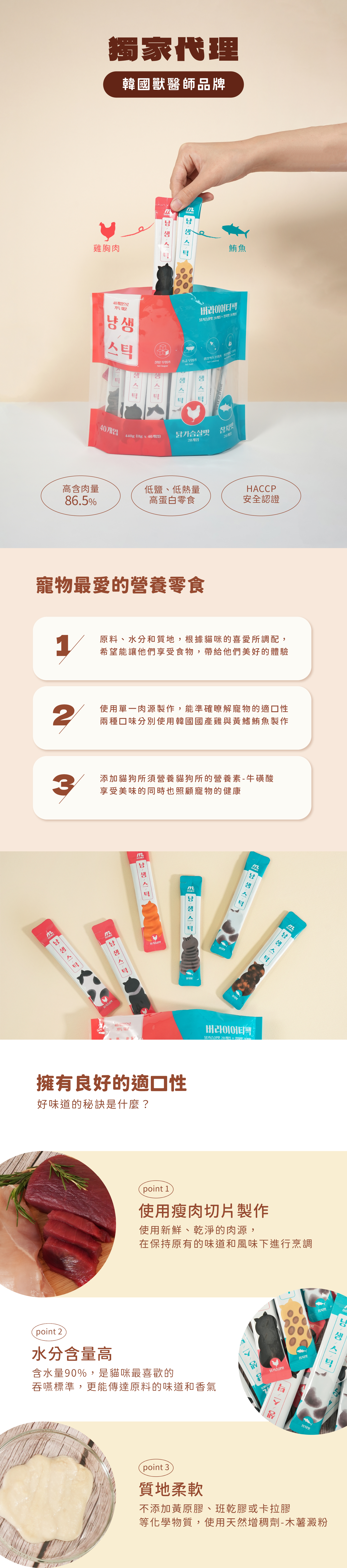 低鈉、低熱量的86.5%高含肉量肉泥,每條鈉含量約為0.04%-0.05%mg,熱量9-10kcal。