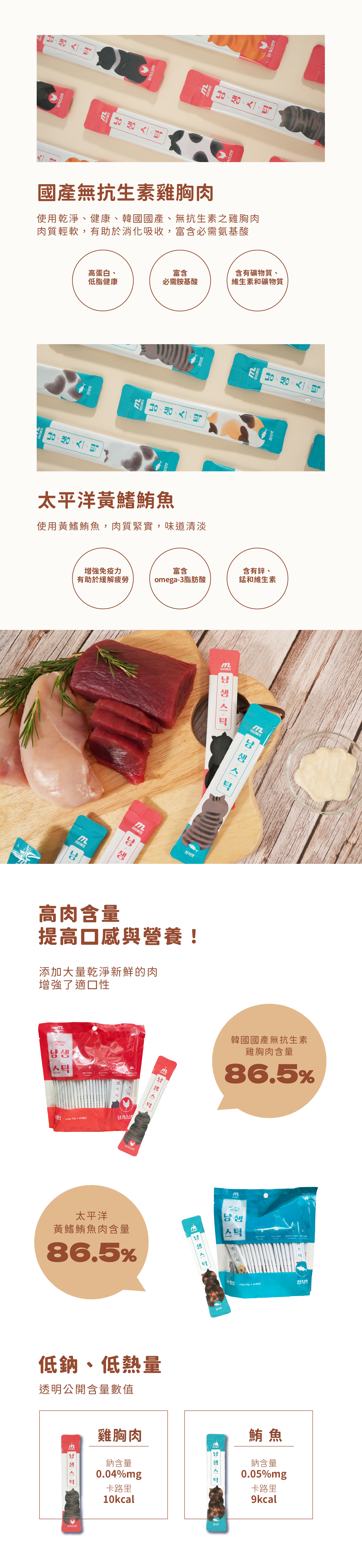 雞胸肉泥條:雞胸肉、水、木薯粉、牛磺酸 鮪魚肉泥條:鮪魚、水、木薯粉、牛磺酸 |