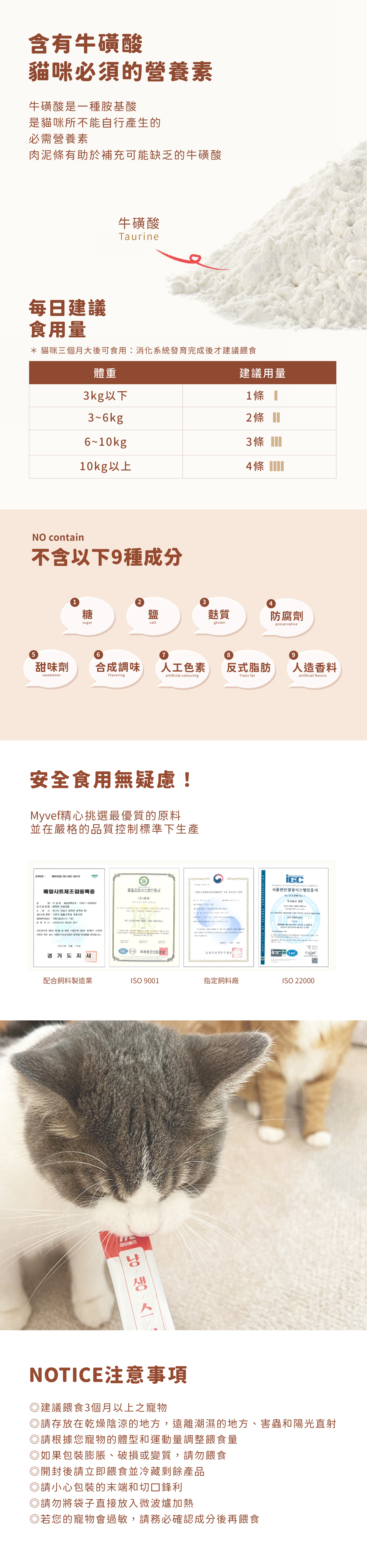 雞胸肉泥條 熱量:10kcal/11g±5% 粗蛋白質>8.0%、凝乳脂肪>0.1%、鈣>0.008%、磷>0.07%、粗纖維<0.2% 、灰分<1.5%、水分<90.0% 鮪魚肉泥條 熱量:9kcal/11g±5% 粗蛋白質>8.0%、凝乳脂肪>0.02%、鈣>0.008%、磷>0.06%、粗纖維<3.0% 、灰分<1.5%、水分<90.0% |