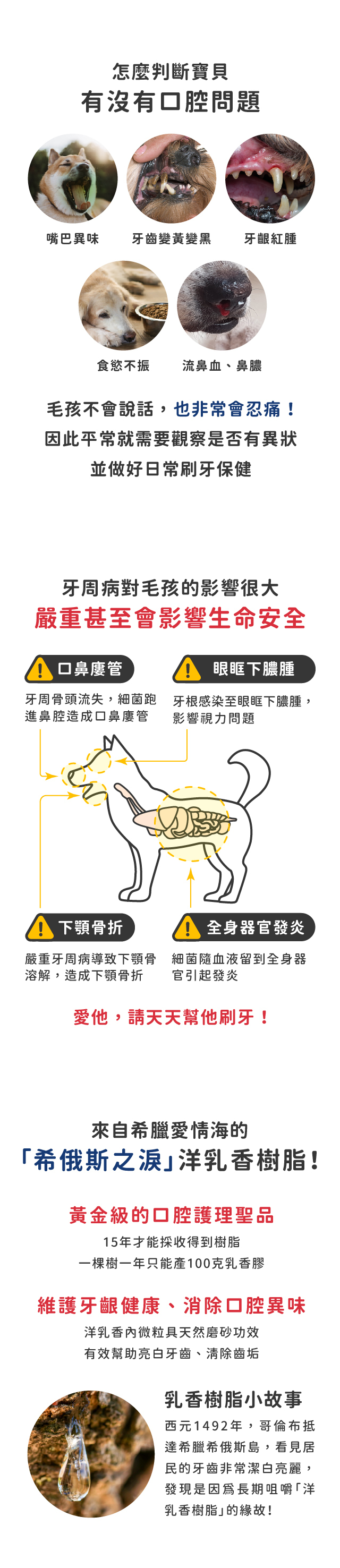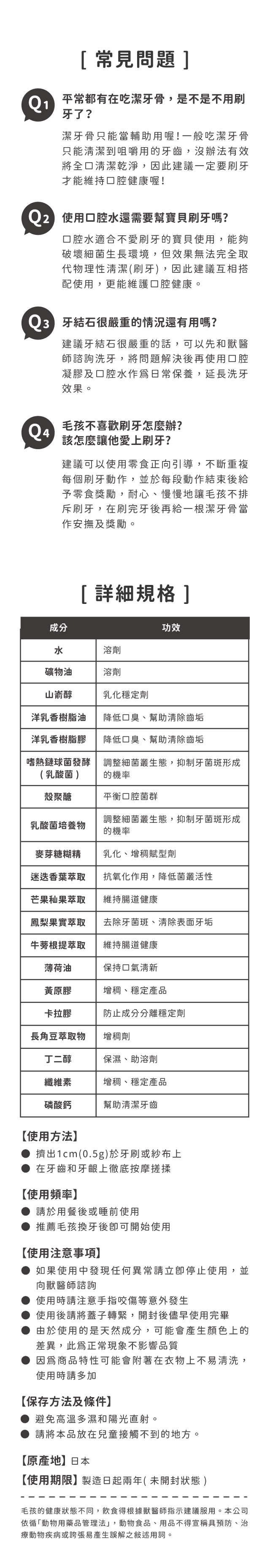 | 注意事項 | • 如果您在使用過程中發現任何異常,請立即停止使用並諮詢您的獸醫師 • 使用時請注意手指咬傷等意外發生 • 使用後,請務必蓋好瓶蓋存放,並盡快使用完畢 • 由於使用天然成分,色調可能存在差異,但不影響品質 • 由於產品的特性,黏在衣服上很難去除,所以請小心使用 |