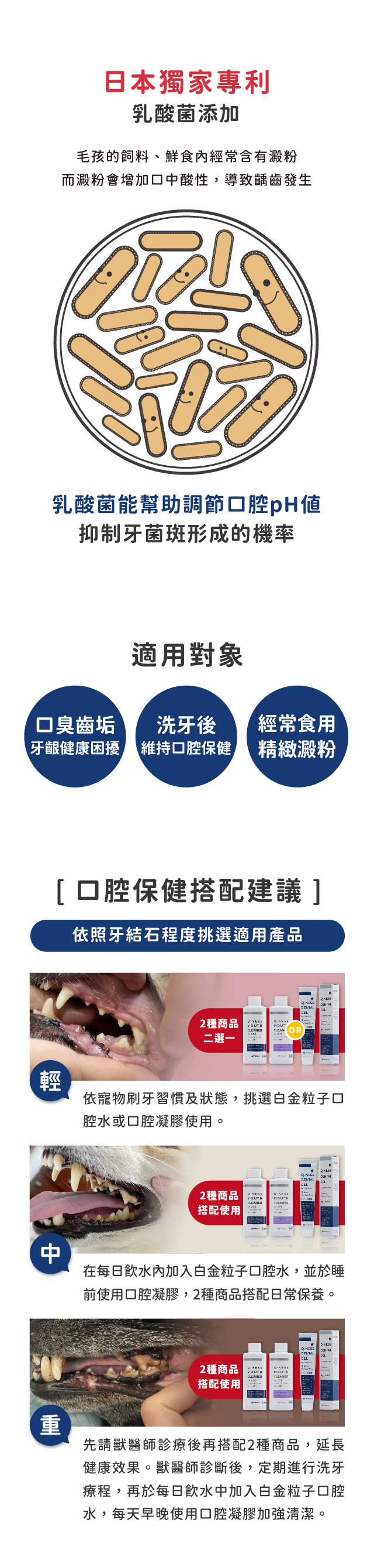 | 注意事項 | • 請勿使用化學溶劑、煮沸水或藥劑清洗,可能會造成牙刷變形或白金奈米粒子變質 • 請避免犬貓啃咬,以免造成破損 • 毛刷上如有黑點係白金奈米粒子成分,屬正常現象 |