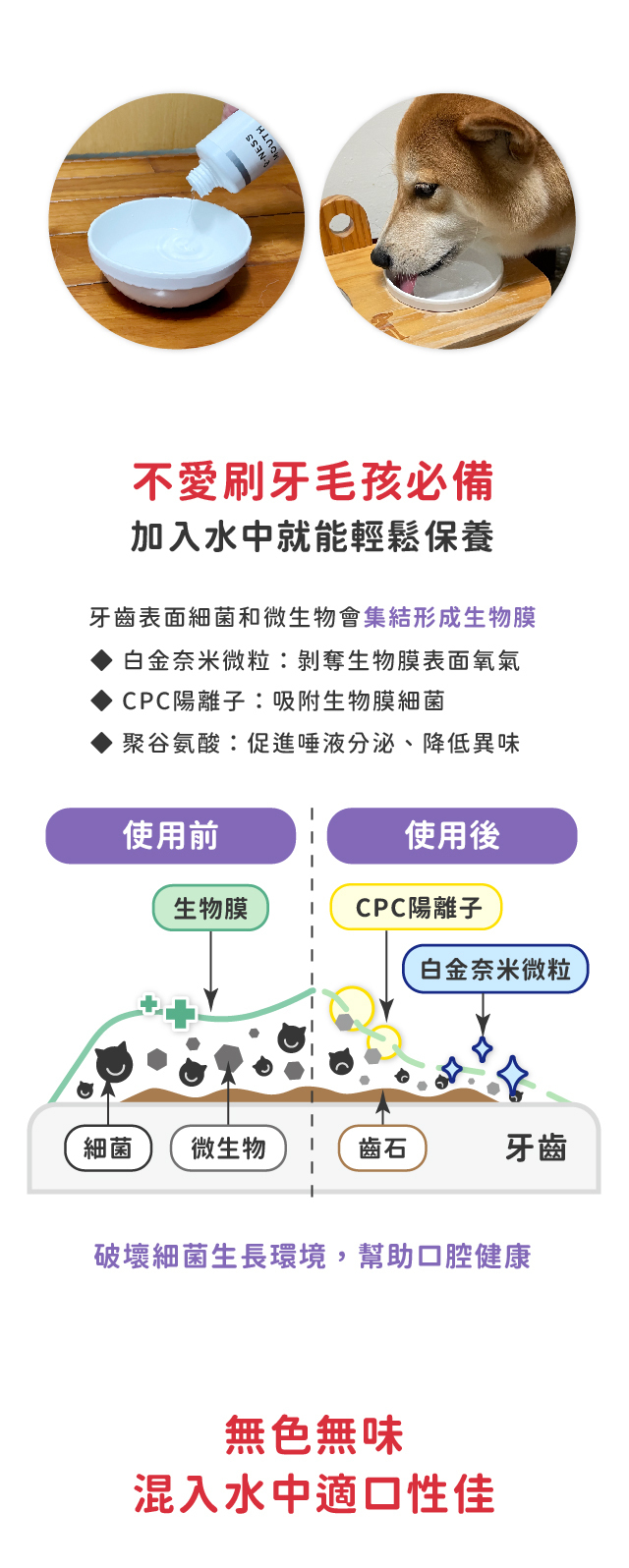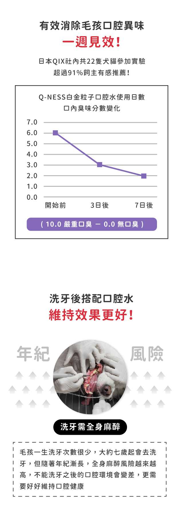 | 注意事項 | • 請勿使用化學溶劑、煮沸水或藥劑清洗,可能會造成牙刷變形或白金奈米粒子變質 • 請避免犬貓啃咬,以免造成破損 • 毛刷上如有黑點係白金奈米粒子成分,屬正常現象 |