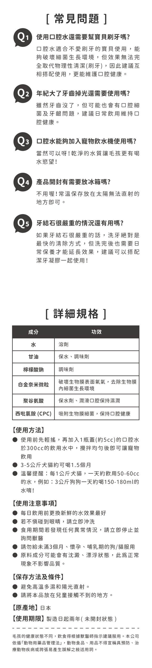 • 如果您在使用過程中發現任何異常,請立即停止使用並諮詢您的獸醫師 • 原成分可能會有漂浮或沈澱,屬於正常現象請安心使用 • 本產品僅適用於狗/貓,請勿用於任何其他目的 • 不適用於懷孕/哺乳期以及小於三個月的狗/貓 • 每次使用前請用新的乾淨飲用水 • 若不慎碰到眼睛,請立即沖洗 |