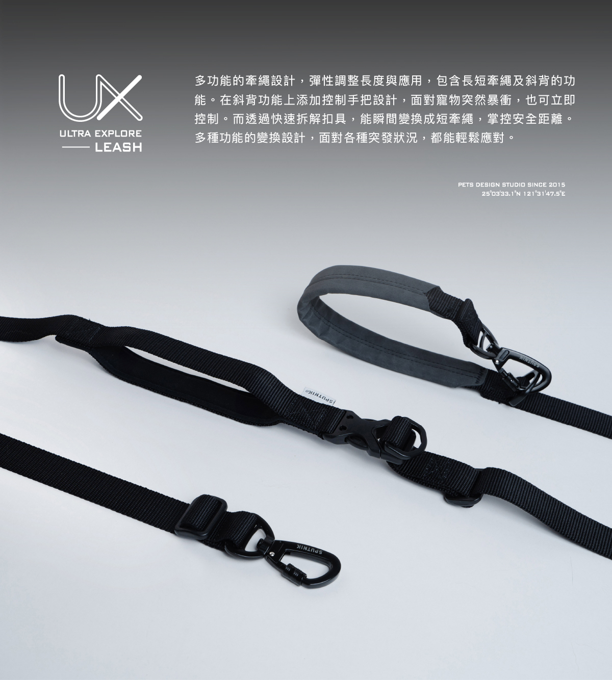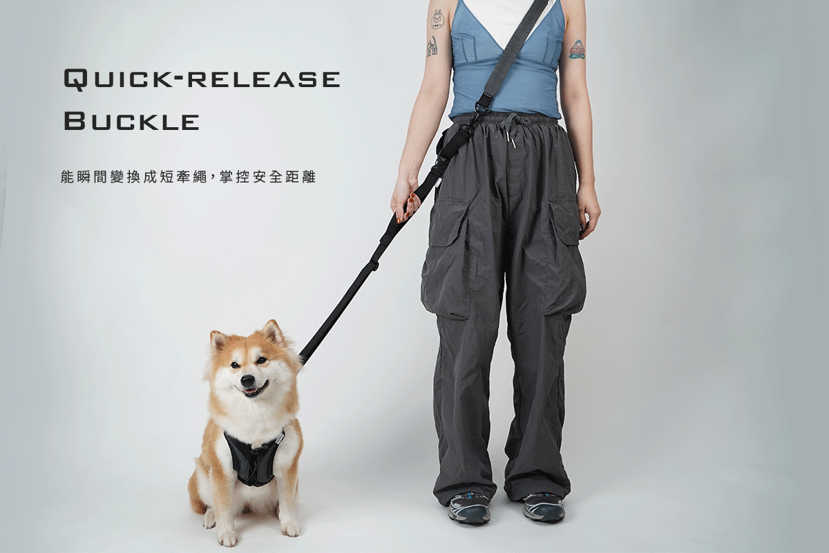 多功能的牽繩設計,彈性調整長度與應用,包含長短牽繩及斜背的功能。在斜背功能上添加控制手把設計,面對寵物突然暴衝,也可立即控制。而透過快速拆解扣具,能瞬間變換成短牽繩,掌控安全距離。多種功能的變換設計,面對各種突發狀況,都能輕鬆應對。