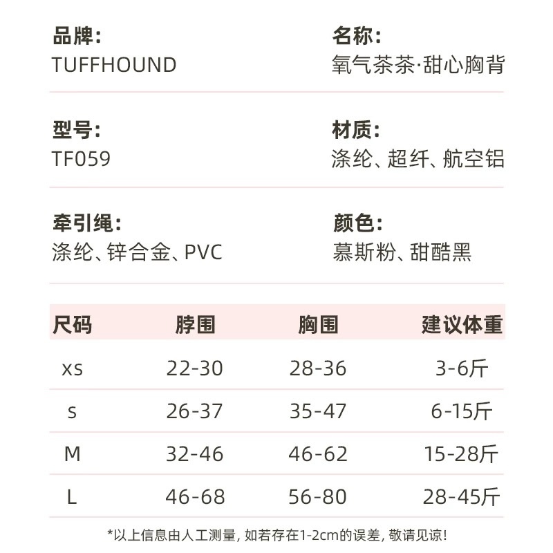 | 規格 | 牽繩:150cm 甜酷黑:S號 脖圍26-37、胸圍:35-47 慕斯粉:L號 脖圍46-68、胸圍:56-80 |